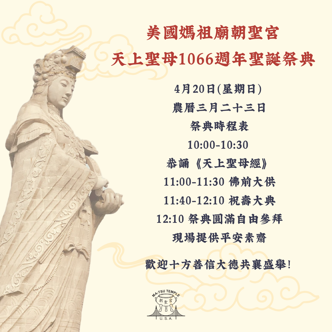 府上男女老幼,如有生肖馬、鼠、牛、兔、雞者, 請安奉太歲,消災解厄、賜福光明平安。 (每人祈安金最少$20元) 詳情請向服務人員查詢 府上男女老幼,如有生肖馬、鼠、牛、兔、雞者, 請安奉太歲,消災解厄、賜福光明平安。 (每人祈安金最少$20元) 詳情請向服務人員查詢 府上男女老幼,如有生肖馬、鼠、牛、兔、雞者, 請安奉太歲,消災解厄、賜福光明平安。 (每人祈安金最少$20元) 詳情請向服務人員查詢 Matsu Temple U.S.A. 2/27/26 Matsu Temple U.S.A. 2/27/26 [法會通啟] 丙午年上元上燈暨安奉太歲法會 Read More Matsu Temple U.S.A. 2/27/26 Matsu Temple U.S.A. 2/27/26 2026丙午年媽祖繞境暨舊金山農曆新年大遊行 Read More Matsu Temple U.S.A. 2/6/26 Matsu Temple U.S.A. 2/6/26 除夕夜來拜媽祖,一起熱熱鬧鬧迎新年! Read More Matsu Temple U.S.A. 2/6/26 Matsu Temple U.S.A. 2/6/26 媽祖廟修繕工程公告 Read More Matsu Temple U.S.A. 10/30/25 Matsu Temple U.S.A. 10/30/25 2026年歲次丙午年安奉太歲、光明燈及文昌燈於2025年11月1日起開始登記 Read More Matsu Temple U.S.A. 10/16/25 Matsu Temple U.S.A. 10/16/25 天上聖母飛昇得道1037週年祭典 Read More Matsu Temple U.S.A. 8/24/25 Matsu Temple U.S.A. 8/24/25 熱烈歡迎 台灣新北市五股妙僊山聖慈宮 蒞臨參香 Read More Older Posts