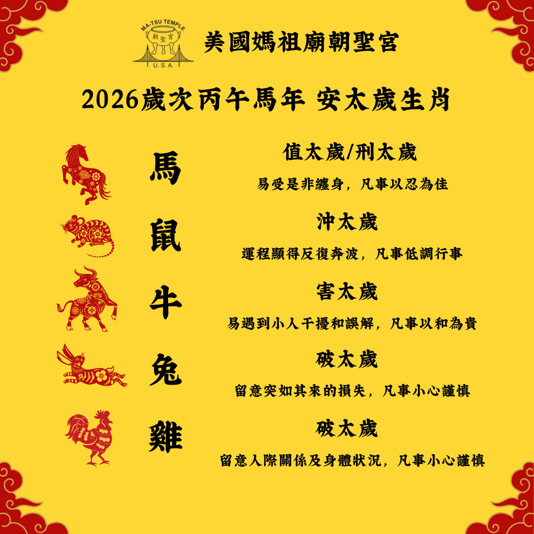 府上男女老幼,如有生肖馬、鼠、牛、兔、雞者, 請安奉太歲,消災解厄、賜福光明平安。 (每人祈安金最少$20元) 詳情請向服務人員查詢 府上男女老幼,如有生肖馬、鼠、牛、兔、雞者, 請安奉太歲,消災解厄、賜福光明平安。 (每人祈安金最少$20元) 詳情請向服務人員查詢 府上男女老幼,如有生肖馬、鼠、牛、兔、雞者, 請安奉太歲,消災解厄、賜福光明平安。 (每人祈安金最少$20元) 詳情請向服務人員查詢 Matsu Temple U.S.A. 10/30/25 Matsu Temple U.S.A. 10/30/25 2026年歲次丙午年安奉太歲、光明燈及文昌燈於2025年11月1日起開始登記 Read More Matsu Temple U.S.A. 10/16/25 Matsu Temple U.S.A. 10/16/25 天上聖母飛昇得道1037週年祭典 Read More Matsu Temple U.S.A. 8/24/25 Matsu Temple U.S.A. 8/24/25 熱烈歡迎 台灣新北市五股妙僊山聖慈宮 蒞臨參香 Read More Matsu Temple U.S.A. 8/10/25 Matsu Temple U.S.A. 8/10/25 美國媽祖廟啟建靈寶祈安植福一朝清醮大法會 Read More Matsu Temple U.S.A. 8/1/25 Matsu Temple U.S.A. 8/1/25 美國媽祖廟乙巳年啟建慶讚中元普渡法會-開放牌位登記 Read More Older Posts